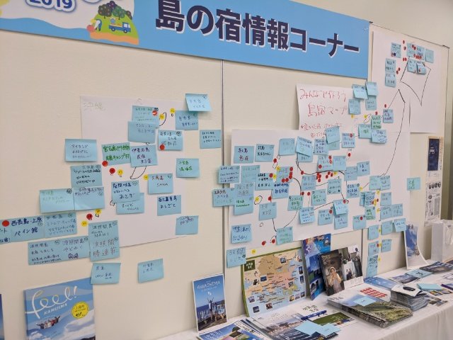 島ブース以外にも見どころたっぷり。壁に貼られているのは「みんなで作ろう島宿マップ」。日本各地の島にあるゲストハウスや民宿などが書かれており、見に来た人が自由に追加できるという手作りのマップ。福江島の雨通宿や波照間島のゲストハウスNAMI、西表島のパイン館など、泊まったことある宿を見つけると嬉しくなります。