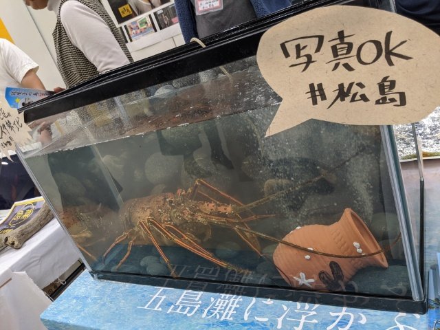 長崎県松島・江島・平島・田島ブースでは西海地区のイセエビの生体展示。大きくてめちゃくちゃ立派なイセエビは、みんなの注目の的。