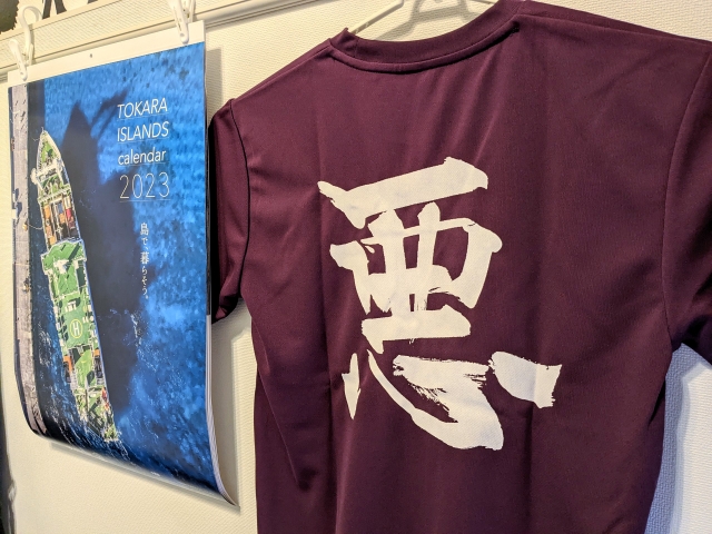 まずはトカラ列島・悪石島の悪Tシャツ!以前島へ行った際に、島の人々がみんな背中に“悪”の字を背負っていて驚いたのですが、ついに購入することができました!白、黒、赤などいろんな色がありますが、紫は新色とのこと。さらに、Tシャツを購入したらトカラ列島のカレンダーももらってしまいました!