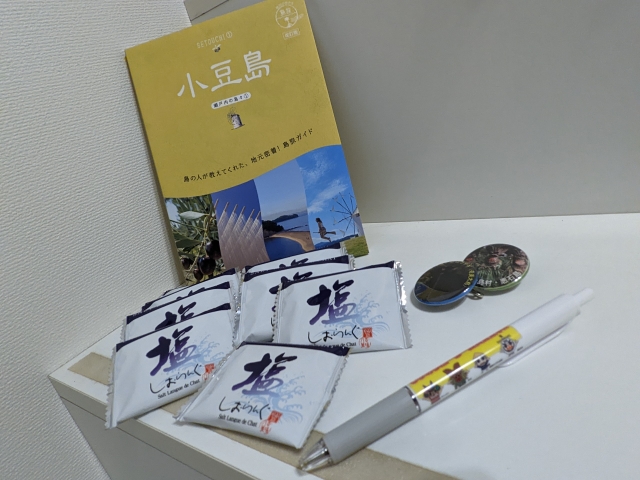 写真左の大量のお菓子は直島の「しおらんぐ」。アンケートに答えたら、「もうすぐ終わりで残ってるから」とたっぷりもらってしまいました!写真右は、鹿児島離島のボールペンと缶バッジ。ボゼやメンドンなど各島の神様がデザインされたユニークなもので、無料配布されてました。立てかけてある書籍は、ご存知地球の歩き方の「小豆島」。アンケートに答えたら一冊いただいてしまいました!