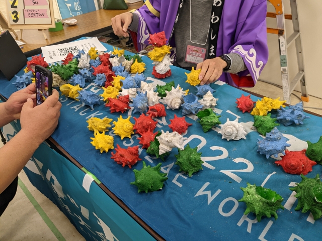 こちらは山形県の飛島による「スタッキングサザエ世界大会2022」。カラーリングされたサザエを何個詰めるかという競技で、制限時間は3分間。3分経過時点での記録となるので、直前で崩れてしまうと記録は1個となります。訪問時点での最高記録は16個とのこと。