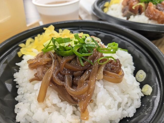 こちらは「寒シマメ漬け丼」(島根県・中ノ島)。肝醤油で漬けたスルメイカがのったどんぶり。臭みもほとんどなくて意外と食べやすいです。