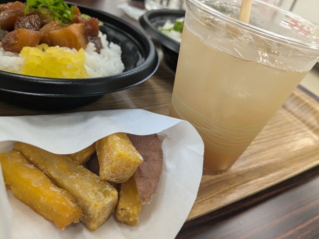 館内には椅子とテーブルが並ぶ休憩エリアがあり、島グルメの販売も行っています。長年通っているアイランダー、今回初めて食事してみることに。