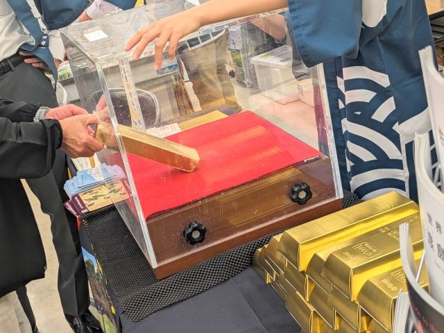 今回も各ブースをみっちりまわっていきましょう!人だかりができているのは新潟県・佐渡島の「金塊レプリカつかみ体験」。ケースに腕を入れて、金塊レプリカを取り出すというシンプルな体験。これ、けっこう力が要ります!実は私はけっこう得意なので、今回も無事成功して景品をいただきました!