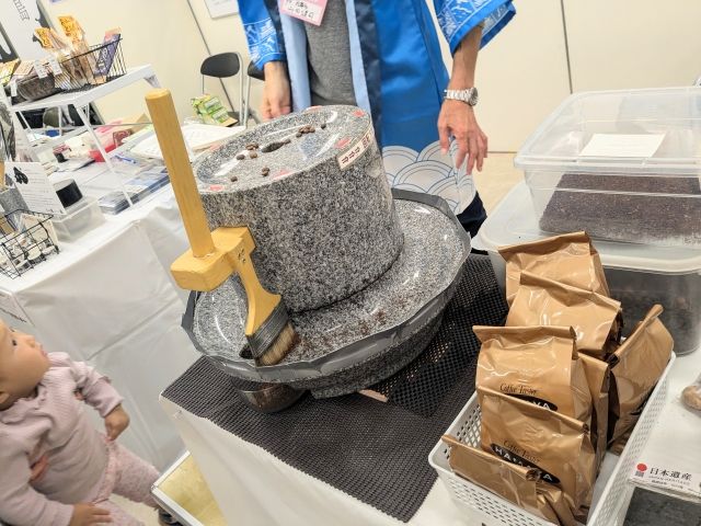 塩飽諸島では、コーヒー豆の石臼挽き体験も。臼を回すとコーヒー豆が粉砕され、同時にブラシも回ることで1箇所に集められていきます。