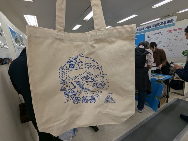 内閣府総合海洋政策推進事務局という非常に名前の長い団体のブースでは、スマホでクイズに答えるとトートバッグのプレゼントも。しっかりした素材でできており、各ブースでもらった大量のパンフレットを入れるのにぴったり。