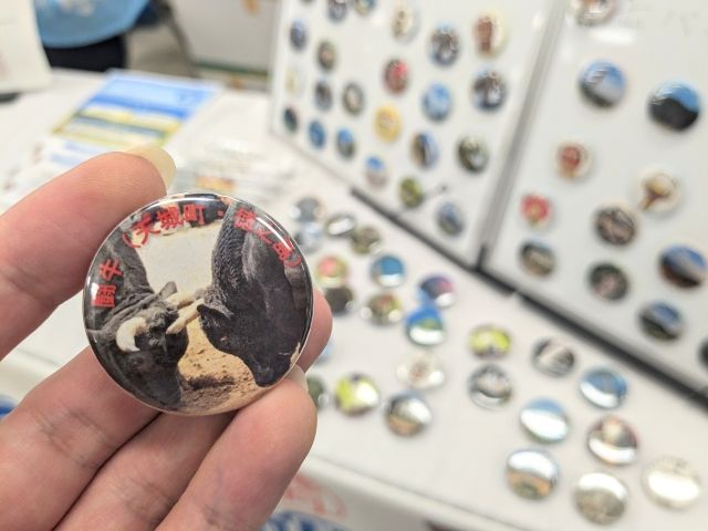 鹿児島離島コーナーでは、鹿児島の様々な島の缶バッジ。ボゼは去年もらったので、今年は最近行ったばかりの徳之島にしました。