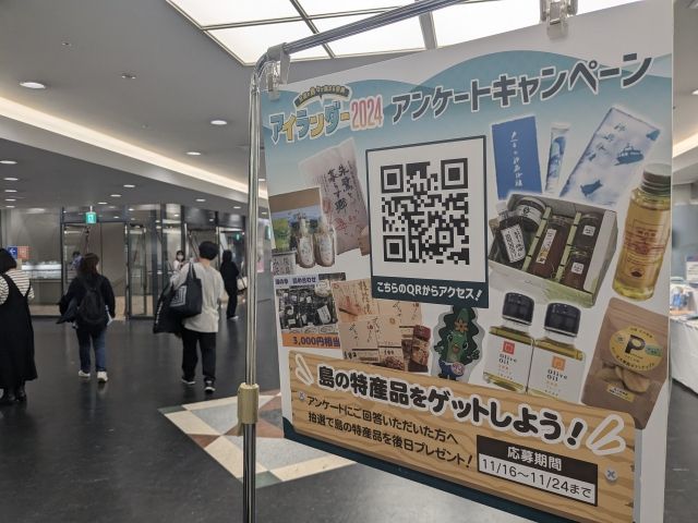 さて!会場内も2~3周して見落としが無いことを確認したので、そろそろ退場します。出口では、スマホで回答するアンケートを開催!これ、応募すると島の特産品がランダムで届くという楽しいキャンペーン。当選確率はけっこう高いので、ぜひチャレンジしてみてください~!