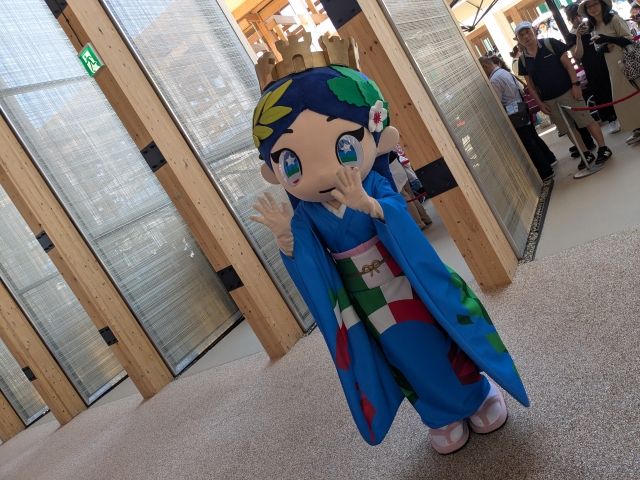内部ではイタリアパビリオンのマスコットキャラクター、その名も「イタリアちゃん」がグリーティング。イタリア文化と日本文化の融合の象徴であるため、イタリアの3色柄があしらわれた振袖を纏っています。