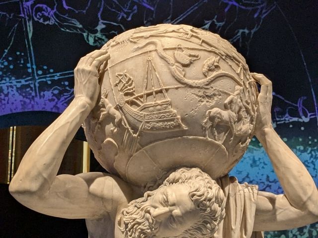アトラスはギリシア神話に登場する天空を支える巨人。膝をつき全身で支えるその天球には、オリオンやケンタウロスをはじめとした様々な星座が刻まれています。