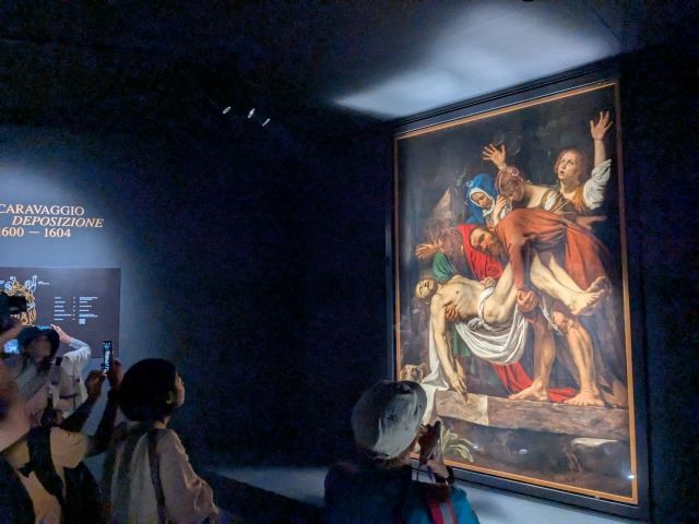 そのすぐそばにある薄暗い部屋に展示されているのはカラヴァッジョの《キリストの埋葬》。1603〜1604年に描かれた絵画で、ヴァチカン美術館が収蔵しています。