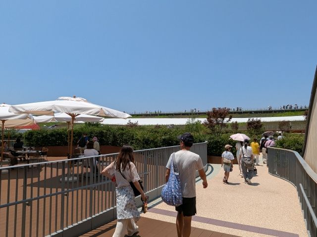 展示室を抜けた屋上は、庭園が広がっています。目の前には大屋根リングが広がる開放的なスペース。レストラン「イータリー」も設置されています。