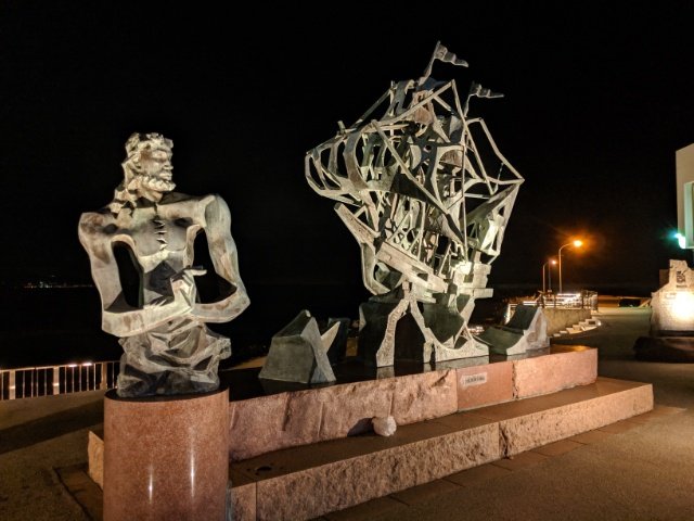 伊東市に暮らす彫刻家・重岡健治さんの作品であるウィリアムアダムスの銅像や按針が設計した「サン・ブェナ・ヴェンツーラ号」の銅像が並びます。