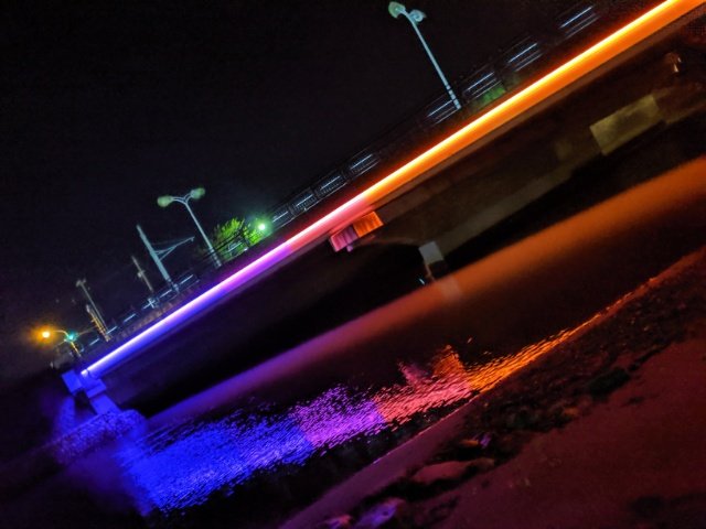 メモリアルパークのすぐ近くにある渚橋は、カラフルにライトアップ。まるでレインボーブリッジのようです。