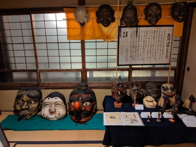 リアルなお面たちは、今にもこちらを睨んできそう。人の気配もなく静かな夜の東海館で出会うと、けっこう怖さがあります。かつてはお土産物として伊東市内を中心に販売されていたとのことですが、これをお土産としてもらったらかなり複雑な心境に陥りそうです。