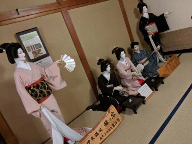 伊東温泉にはかつてお座敷文化が栄えていました。東海館の大広間には、お座敷の花形である芸妓さんのマネキンや三味線が展示されています。