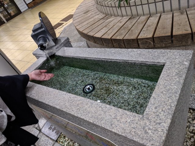 トリックアートの傍らには福招きのお手湯があります。こちらは夜でも利用可能。こんこんと流れるお湯に手を浸せば、冷え切った手先がちょっとだけ温まる。お湯の排出口が映写機のカタチをしており、ちょっとした遊び心を感じます。
