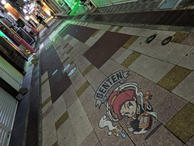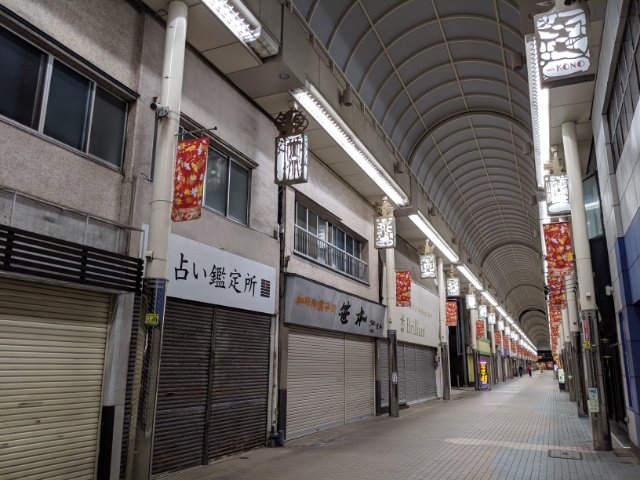 夜は一部の飲食店を除きほとんどの店が営業終了してシャッターが降りていますが、明るいBGMが流れているため何だか不思議な空間。