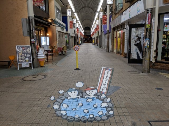 地面には、温泉を描いたトリックアート。サンバイザーをした白いキャラクターはキネオとキネコ。このキネマ通りのキャラクターです。