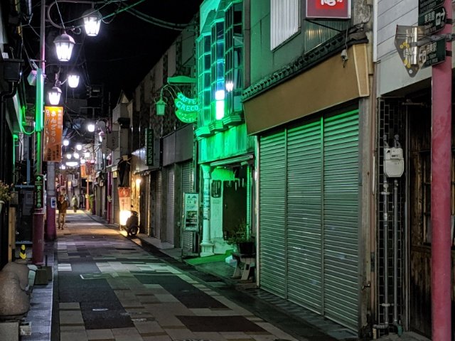 伊東駅のすぐ近くに延びる商店街。昼間は食べ歩きやお土産探しが楽しめるのですが、夜はやっぱりほとんどの店が閉店しています。