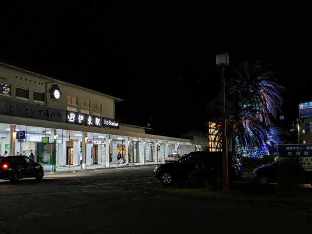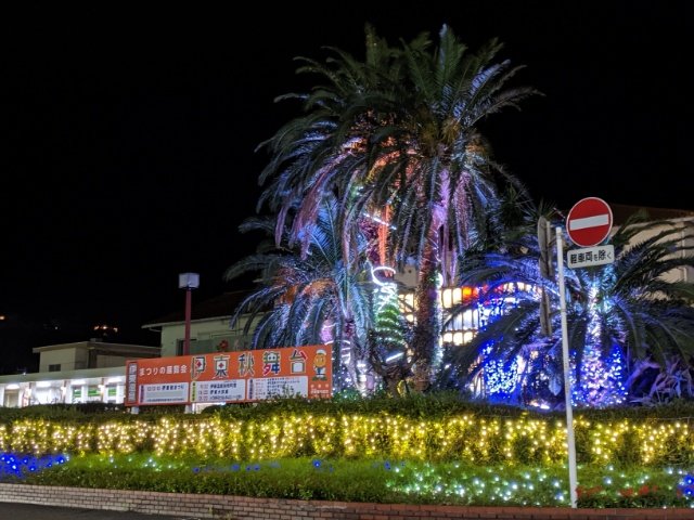 駅前のフェニックスの木は、怪しげにライトアップ中。伊東線の開業を記念して植えられた雌雄一対のヤシの木で、「夫婦ヤシ」と呼ばれているそう。
