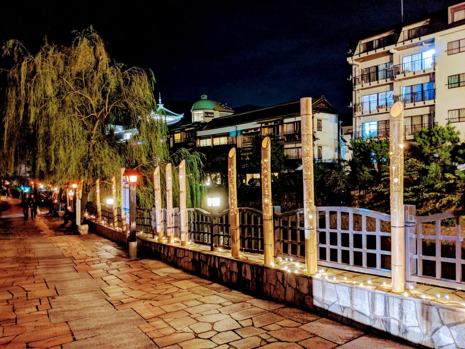 松川(伊東大川)沿いに造られた約1kmの遊歩道。川のせせらぎとしだれ柳のコンボが決まり、とっても風流な散歩道となっています。竹をくり抜いて作られたライトアップで、夜はうっすらと明かりが灯ります。