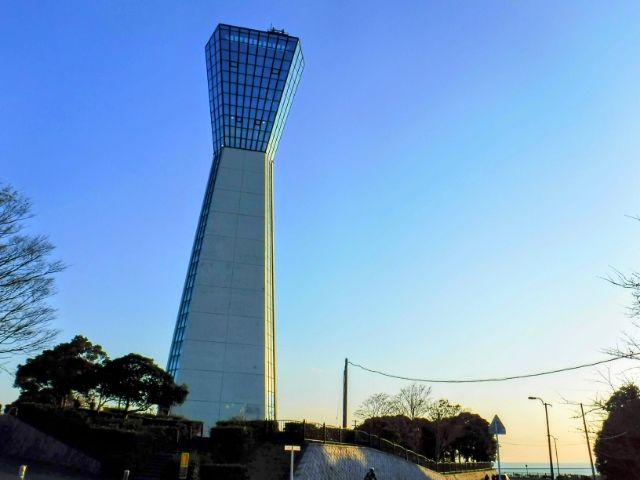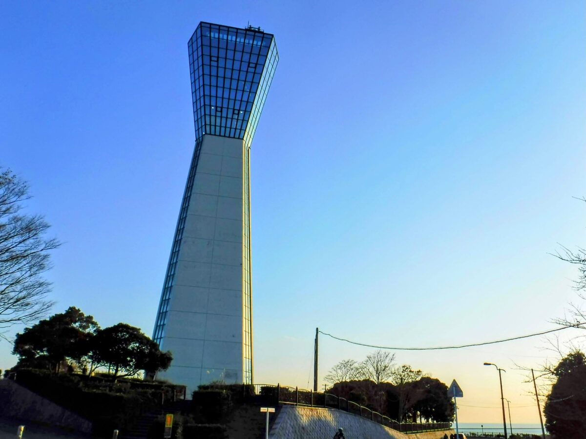三崎公園に建つ真っ白なタワー。いわき市のランドマークの1つとも呼べる印象的なデザインをしています。文字通りタワーのてっぺんに立てるスカイデッキは圧倒的な開放感です!