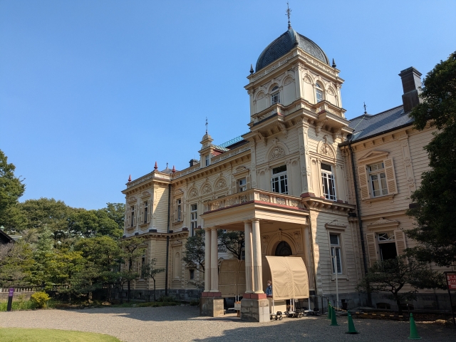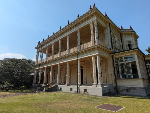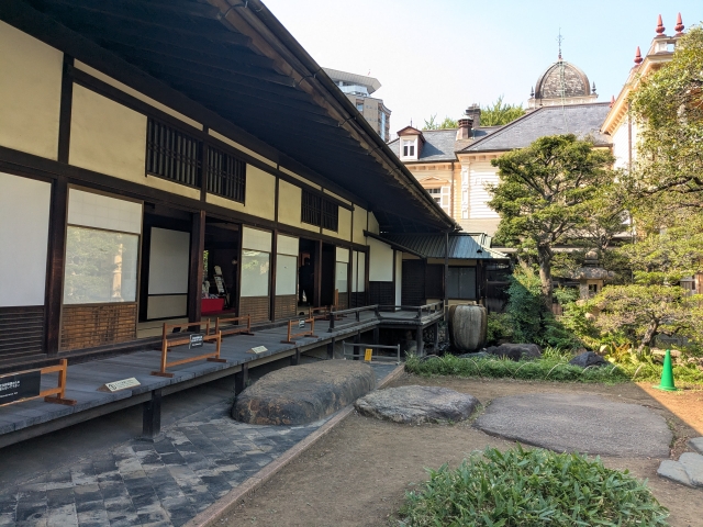 明治29年(1896年)に洋館とともに完成したのが和館。洋館とは異なり、棧瓦葺の純和風建築です。洋館とつながっており、靴を脱いだまま洋館から和館へと順路が続いていくルートとなっています。