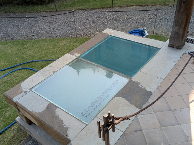 この撞球室、洋館と地下通路でつながっています。通路部分を見ることはできませんが、明かり取りであるガラスの窓は見ることができます。この下に通路があるのですね。