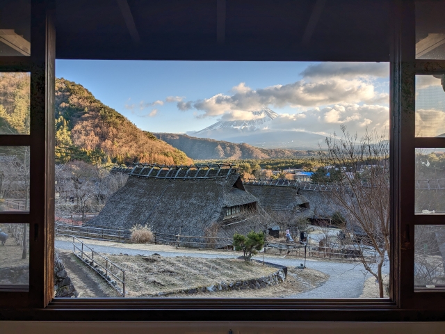 その名の通り眺望が楽しめる「見晴らし屋」の2階からは、富士山と集落を一望できます。