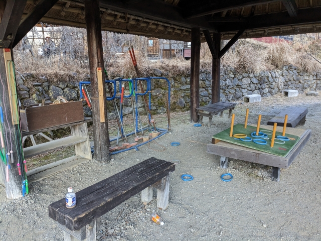 集落中央にある広場では、竹馬、なわとび、輪投げ、羽子板なんかもあります。童心にかえって遊んでみてはいかがでしょうか。