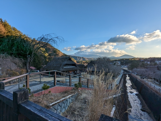 入場料を払って園内に入ると、目の前に広がるのは茅葺き屋根の民家が立ち並ぶ情緒あふれる景観。まるで岐阜県の白川郷や富山県の五箇山、京都の美山のようなノスタルジックな景観で、歩いているだけで心が穏やかな気持ちになってきます。同じ富士五湖エリアの「忍野八海」と近いテイストですが、こちらの方がずっと落ち着いた印象です。