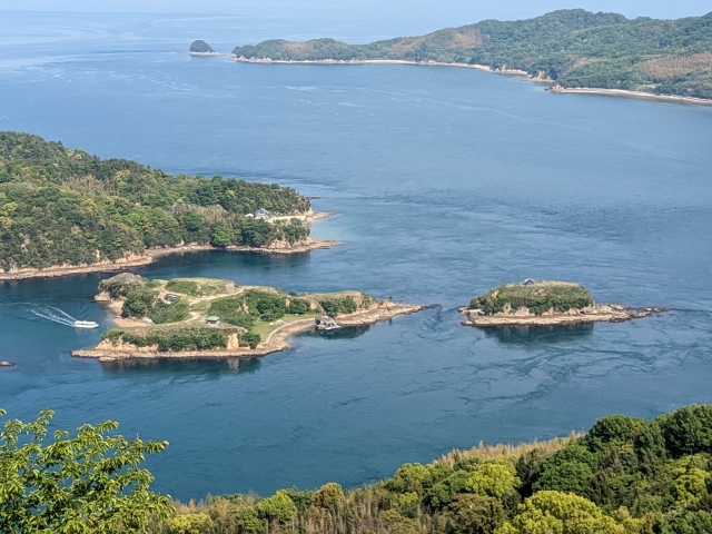また、能島と鯛崎島からなる能島城跡が見渡せるのもこの展望台のポイント。タイミングが合うと、激しい潮流に流されるように進む「能島水軍潮流体験船」の姿も見ることができます。
