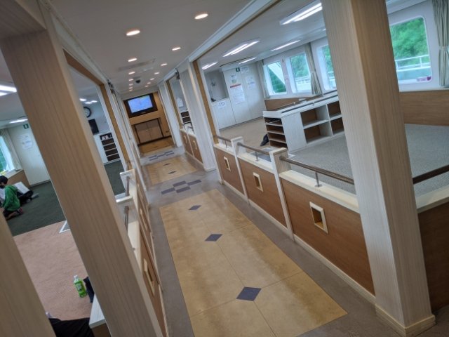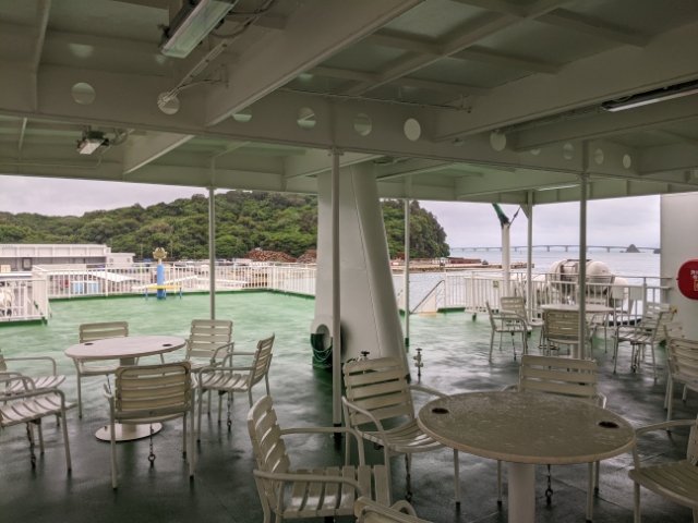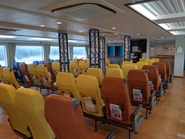 船内はとっても広々。きれいに掃除されてて気持ち良いです。あまり観光イメージの無い島ですので、乗客は地元の方々や釣り人、仕事のおじさんがメイン。ローカルな雰囲気がたまりません。
