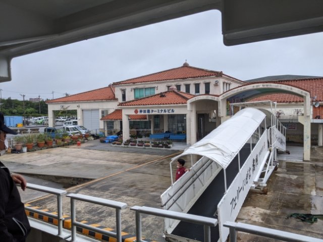 約55分の船旅を終えて到着した伊是名島の玄関・仲田港。赤瓦のターミナルには乗船窓口と売店が入ってます。