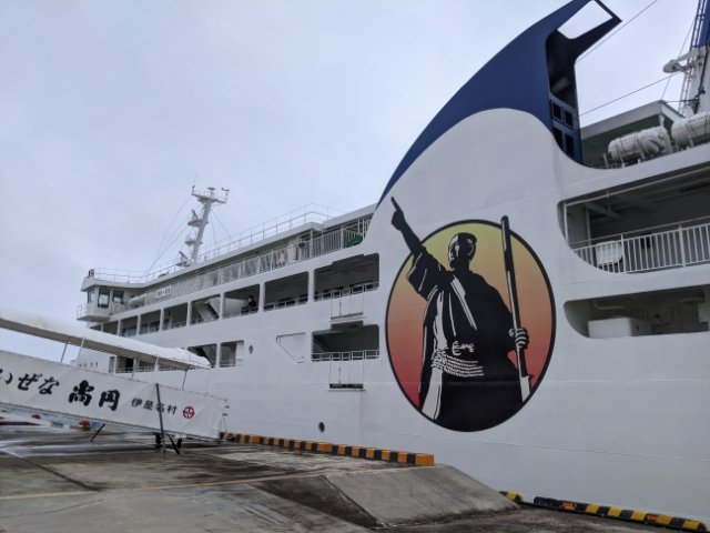 こちらが運天港と伊是名島(仲田港)を結ぶフェリーいぜな尚円。かなり大型のフェリーで、ボディに描かれた尚円王のイラストがとってもかっこ良い。