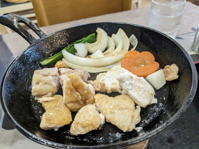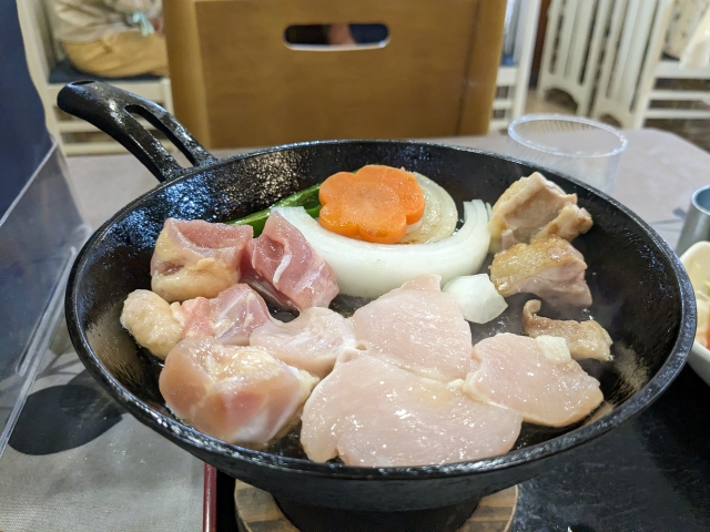ただし、色々と焼きながらTKGを作ったりしていると意外と忙しいです。私はうっかりしており、まだ焼き終わってないのに火が燃え尽きてしまいました。そんなときは慌てずに店員さんに頼めば燃料を追加してくれます。店員さんもけっこう気にかけてくれており、「火、消えてますよね!燃料お持ちしますね!」とすぐに気が付いてくれました。モモ肉は火が通りにくいので、最初に全部乗せておいた方が良いかもしれません。