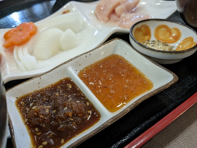 焼き上がった鶏肉は、味噌ダレ、焼き肉ダレ、塩コショウの3つの調味料で楽しむことができます。いずれもオリジナリティあふれる風味。ムネ肉は塩コショウでさっぱりと、モモ肉は焼肉ダレでこってりと食べるのが合う気がしました。