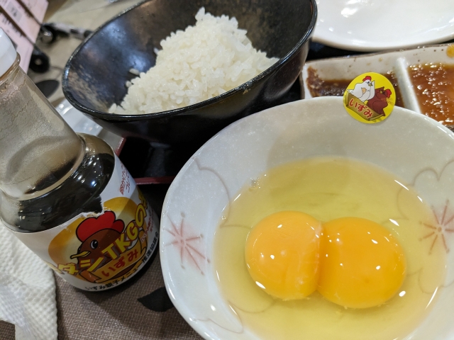 いずみ親子ステーキごはんには、もれなく生卵がついており、卵かけご飯を楽しむことができます。産まれていないため子ではないのではという点が若干気になりますが、それを口にすると親子丼の立場が危うくなるのでそんなことは気にせずTKGにしましょう。ちなみに卵黄が双子でちょっと得した気分に。
