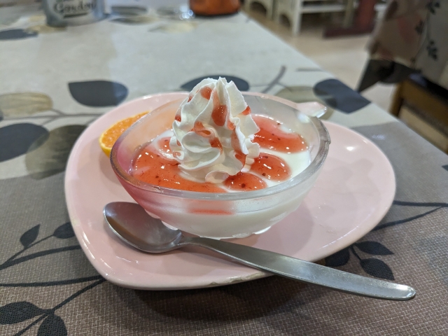 食べ終わったのでお会計へ進もうとすると、デザートがついているとのこと。ハートのお皿に乗った手作り牛乳プリンはとっても美味でした!