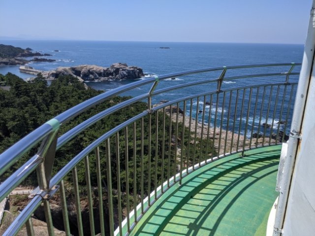 てっぺんまで登ると屋外へ出ることができます。開放的すぎる構造なのでなかなかのスリルですが、青い海の絶景が広がります。周辺には柱状節理や海蝕地形が広がっており、ダイナミックな景観です。