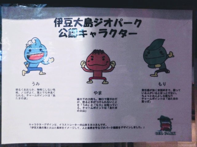ユニークなキャラを見つけました!こちらは伊豆大島ジオパークのキャラクターで、その名も「うみ」「やま」「もり」。シンプルすぎる名前が潔いです。