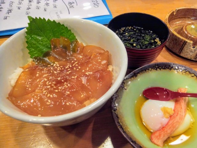 今日のメニューは伊豆諸島名物べっこう丼!べっこうのように色づいた、醤油に漬けたお刺身の丼です。使用しているのは普通の醤油ではなく、大島名物のとうがらし醤油。ピリッとした風味がすごく美味しくて、くせになる味です。