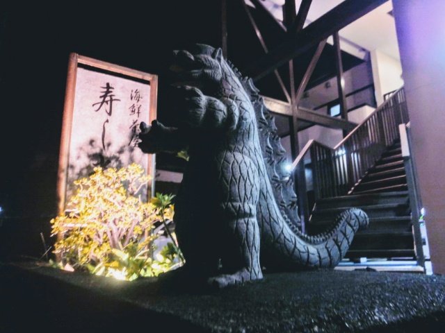 夕飯は、同じく元町港付近の寿し光へ。入り口には、大島名物のゴジラ!