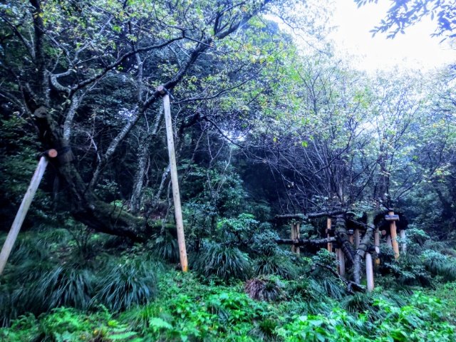 こちらがサクラ株。樹齢800年といわれる古いオオシマザクラの木です。いくつもの柱で支えられた姿は、威厳ある老樹といった雰囲気です。