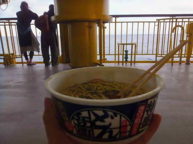 伊豆大島→東京は4時間くらいなので、席なしでも全然平気!デッキで食べるどん兵衛。ほんのり潮風風味。