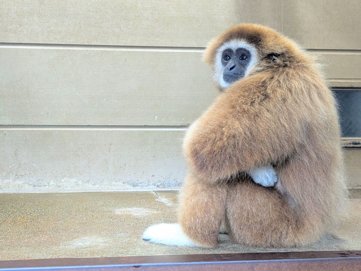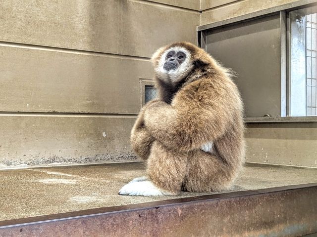 腕と足を組んでかっこ良くキメるシロテナガザル。何かを悟ったかのような表情で宙を見つめる姿は、まるで役者のようです。出で立ちはカッコ良いですが、つぶらな瞳がとってもかわいいです。