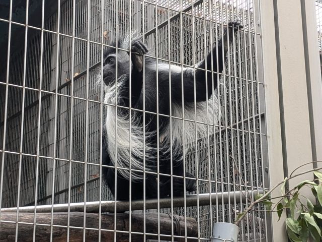 白と黒の2トーンカラーが美しいアビシニアコロンブス。ジュリアーノ・ヴァンジの《壁をよじ登る男》のようなポージングと、物憂げな表情が深みを感じさせます。