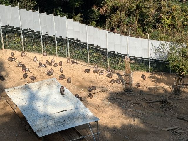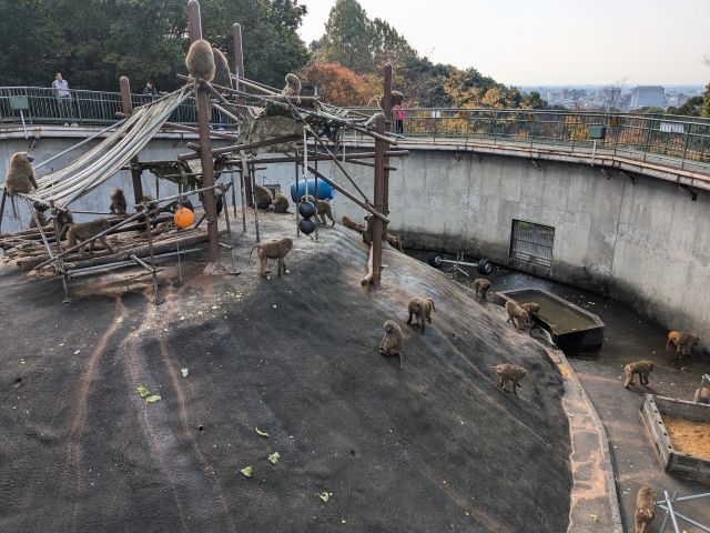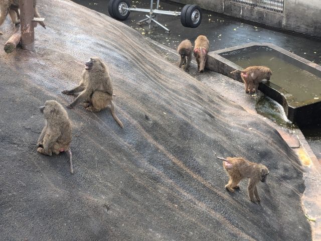 もう1ヶ所サル山があります。こちらはニホンザルよりもひと回り大きなヒヒ!アヌビスヒヒが70頭もおり、「ヒヒの城」と呼ばれています。