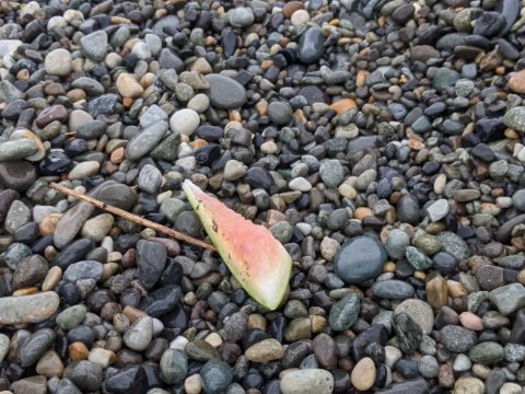 途中、誰かが食べたであろうスイカの皮が。最初は特に気にしていなかったのですが、石探し中に定期的に出現します。誰かスイカ割りでもしたのでしょうか。